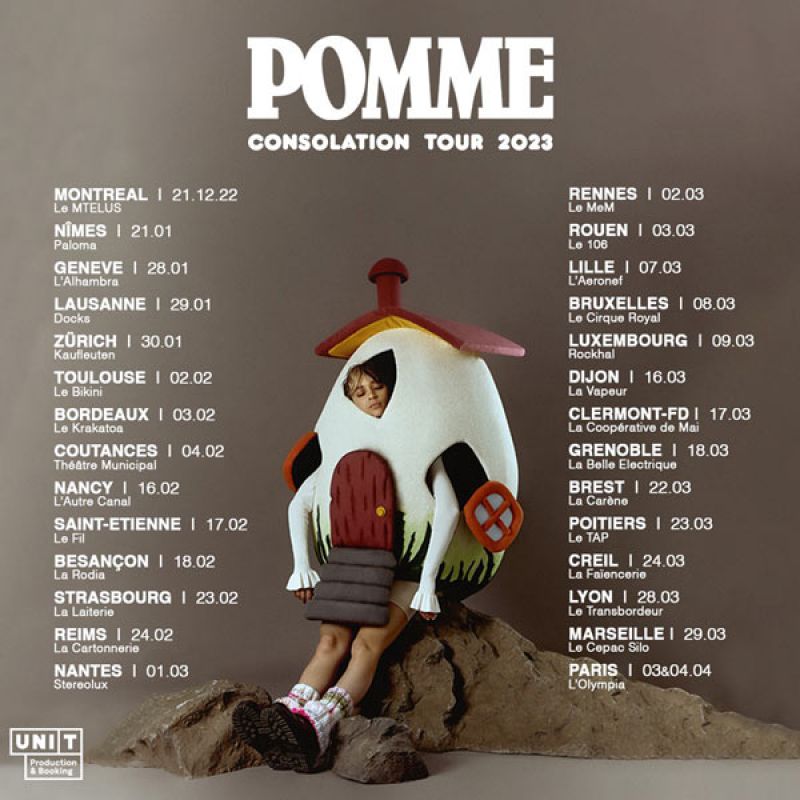 lors qu’elle remporte le prix de l’Artiste féminine aux Victoires de la Musique en février 2021, Pomme s’attèle à l’écriture des titres de l’album Consolation, qui succèdera ce 26 août 2022 à son deuxième album Les Failles, paru en 2019, et acclamé depuis.