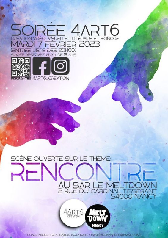 • Tu as envie de t'exprimer et tu recherches une opportunité de présenter tes créations ? Tu réalises des œuvres visuelles, vidéos, sonores, ou littéraires ? Viens nous présenter ton interprétation du thème de la soirée en t'inscrivant par ici -> https://association4art6.wixsite.com/4art6