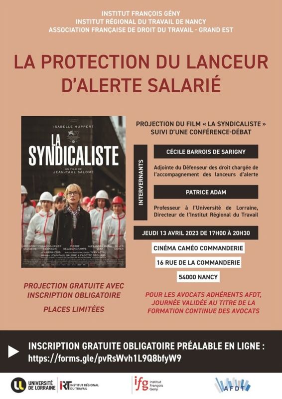 Projection du film La syndicaliste, de Jean-Paul Salomé, suivie de la conférence "La protection du lanceur d'alerte salarié" par Cécile Barrois de Sarigny, adjointe du Défenseur des droits chargée de l'accompagnement des lanceurs d'alerte, et Patrice Adam, Professeur à la Faculté de droit de Nancy.