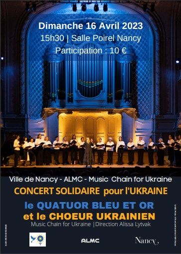 Organisé conjointement par la Ville de Nancy et l’ALMC, un concert est organisé le dimanche 16 avril 2023 à 15h30. Il sera un témoignage de solidarité pour le peuple ukrainien et pour les artistes réfugiés. Un projet ambitieux, solidaire et artistique. La scène de la salle Poirel accueillera le chœur de femmes dirigé par Alissa Litvak. Fin novembre 2022 en effet, un chœur de femmes ukrainiennes a vu le jour pour permettre aux réfugiés ukrainiens de se retrouver régulièrement autour de la musique, dans une ambiance de partage, créative et joyeuse. Ce chœur a pu se produire dans différents lieux et notamment le 1er février dernier, salle Gaveau à Paris. A Nancy, 23 chanteuses feront vivre la tradition chorale ukrainienne. Cette tradition très ancienne est le reflet d’une identité, le miroir poétique de tout un peuple. Sacrée ou folklorique, elle représente la grande richesse culturelle de l’Ukraine.