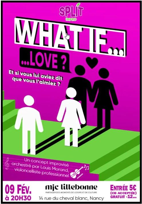 La Compagnie Split Impro créée en 2023 qui épouse humour fruité et pépins de génie vous propose son premier long format What If Love, suivi d’un cabaret totalement déjanté où vous allez vous fendre la poire ! FB & INSTA @splitimproTout public