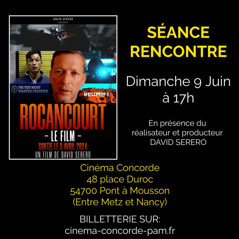 "ROCANCOURT, Le Film", sur les vies de Christophe Rocancourt, est le dernier film du réalisateur et producteur David Serero. Il sera présenté au cinéma Concorde le dimanche 9 juin à 17h à Pont à Mousson.