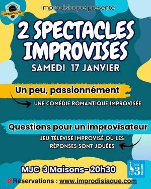"Un peu, passionnément" : comédie romantique improvisée ou le public choisit le destin d'un amour naissant ... Vont-ils s'aimer ? Ou semer le trouble dans leur couple ? "Question pour un improvisateur" : bienvenue sur Channel 1 et son émission de culture générale... déjantée. 1 animateur, 5 candidats, des questions et des réponses qui partent en impro ... À qui les 100 000 euros ?
