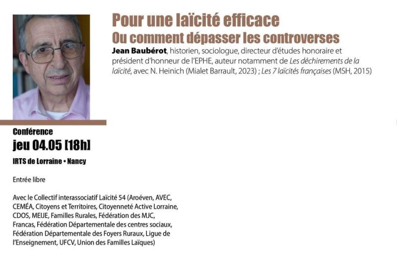 Avec le Collectif interassociatif Laïcité 54 (Aroéven, AVEC, CEMÉA, Citoyens et Territoires, Citoyenneté Active Lorraine, CDOS, MEIJE, Familles Rurales, Fédération des MJC, Francas, Fédération Départementale des centres sociaux, Fédération Départementale des Foyers Ruraux, Ligue de l’Enseignement, UFCV, Union des Familles Laïques)