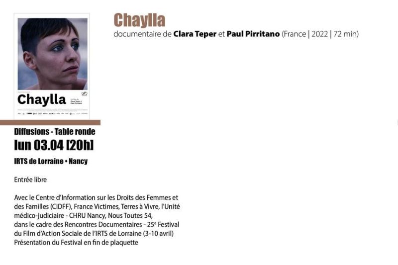 Avec le Centre d'Information sur les Droits des Femmes et des Familles (CIDFF), France Victimes, Terres à Vivre, l'Unité médico-judiciaire - CHRU Nancy, Nous Toutes 54, dans le cadre des Rencontres Documentaires - 25e Festival du Film d’Action Sociale de l’IRTS de Lorraine (3-10 avril)