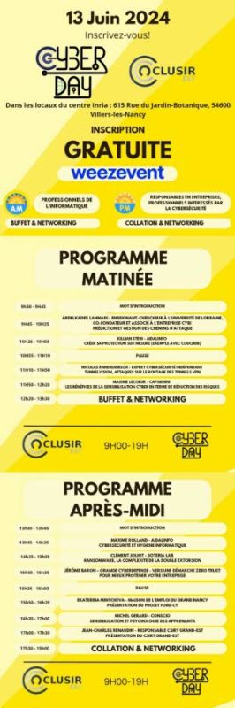 Journée organisée par le Clusir Est. Le risque informatique touche de plus en plus d'entreprises, des moyens existent pour réduire le risque. Venez découvrir lors de conférences comment faire, en utilisant des conseils ou des aides gratuites de la grande région