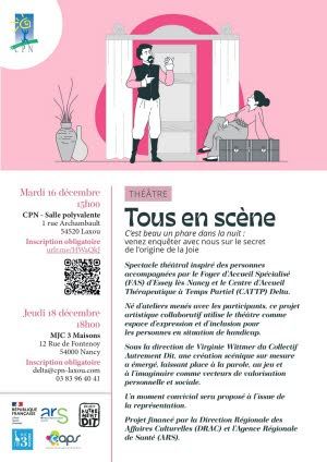 Dans le cadre du programme culturel 2025 du Centre Psychothérapique de Nancy , le CATTP Delta et le Foyer d’Accueil Spécialisé (FAS) d’Essey-les-Nancy proposent deux représentations d’un spectacle théâtral intitulé « Tous en scène » : C’est beau un phare dans la nuit. Sur inscription.