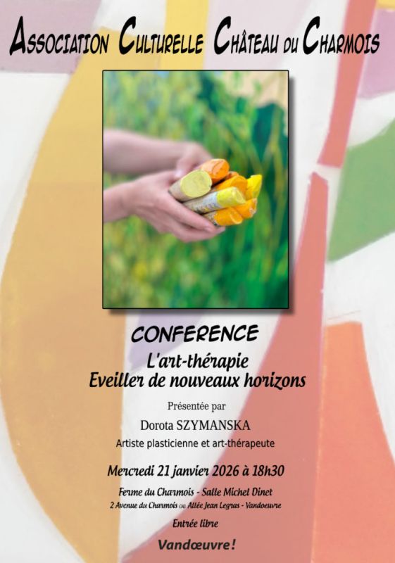 Michèle Donati nous fait parvenir l’invitation pour la conférence « L’art-thérapie Éveiller de nouveaux horizons », organisée par l’ACCC et présentée par Dorota Szymanska, responsable du « Cours de Dessin et Peinture » de l’AAAHV.