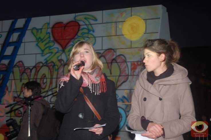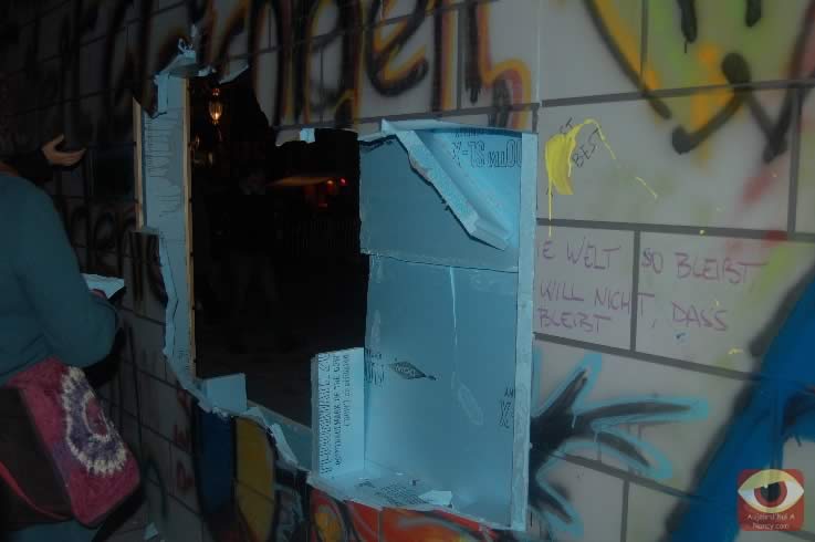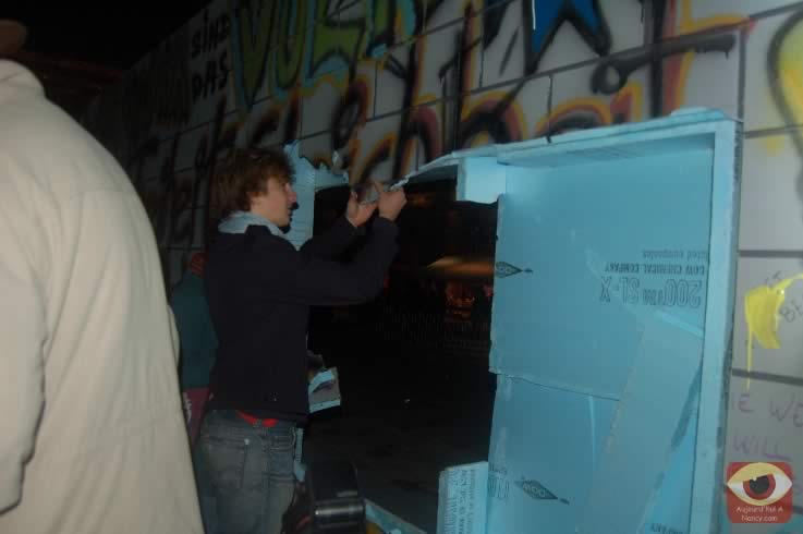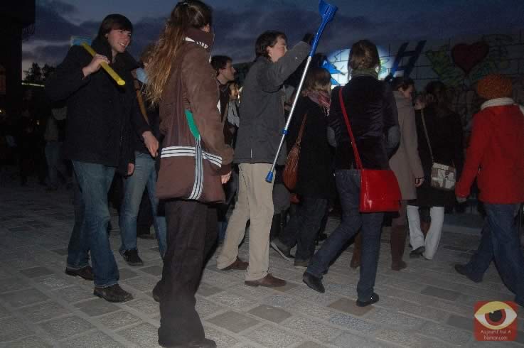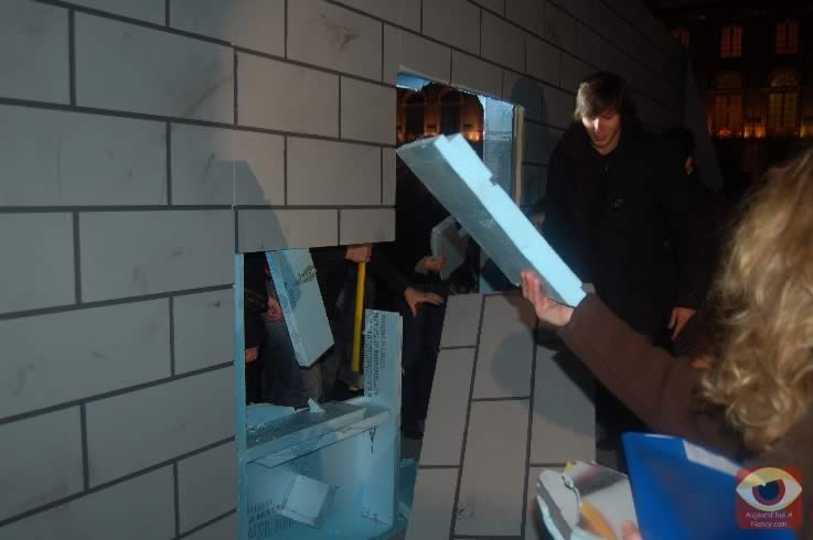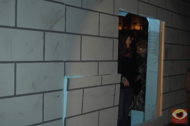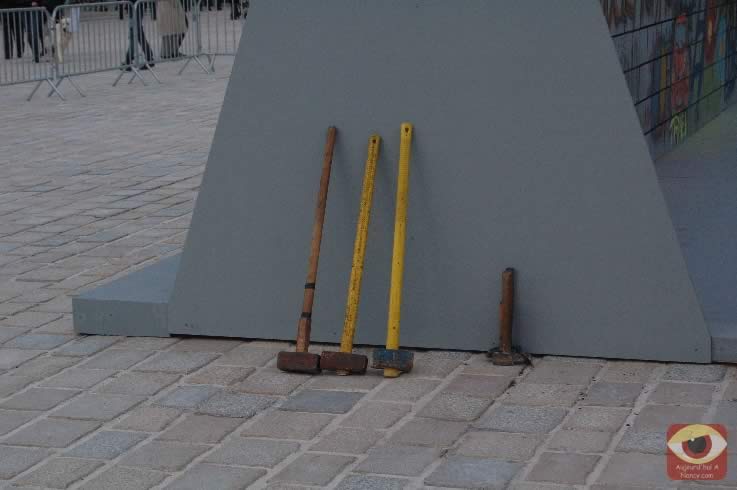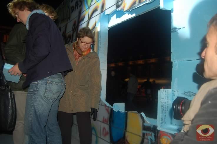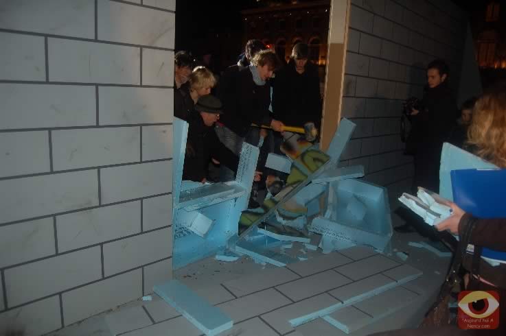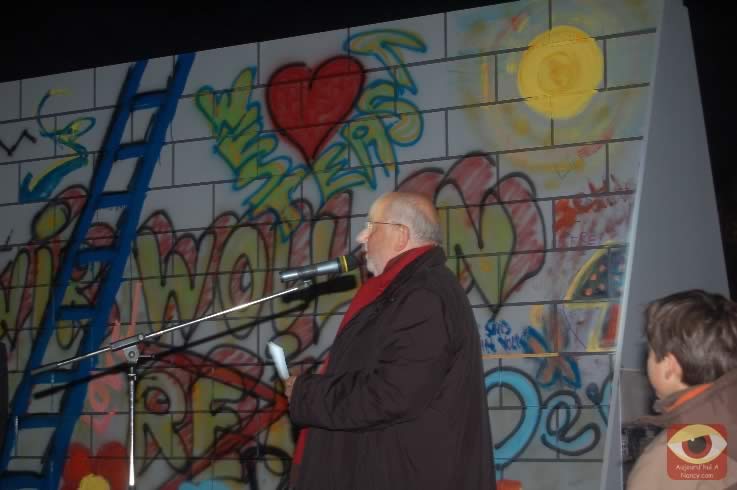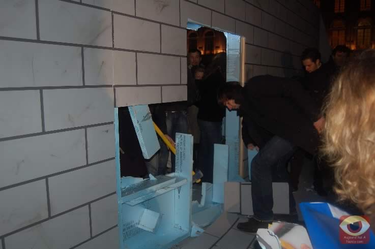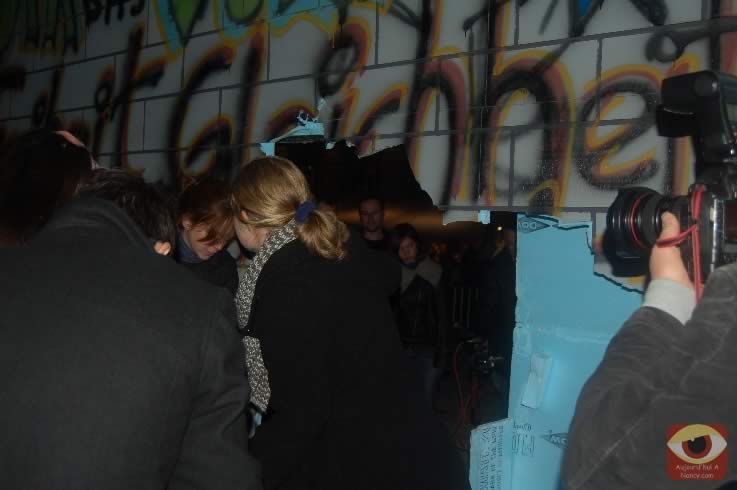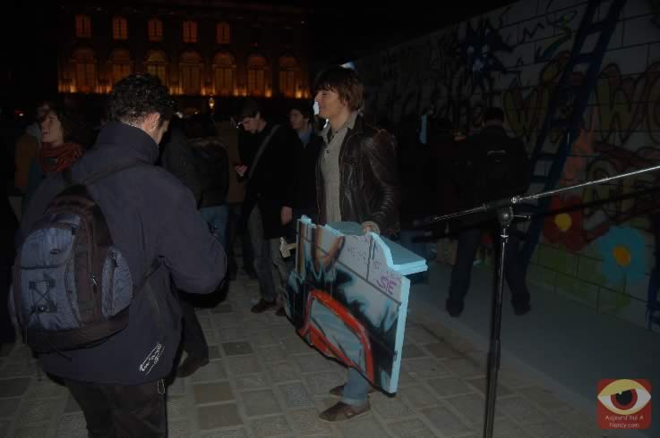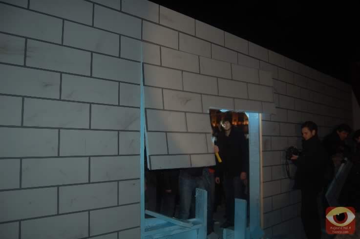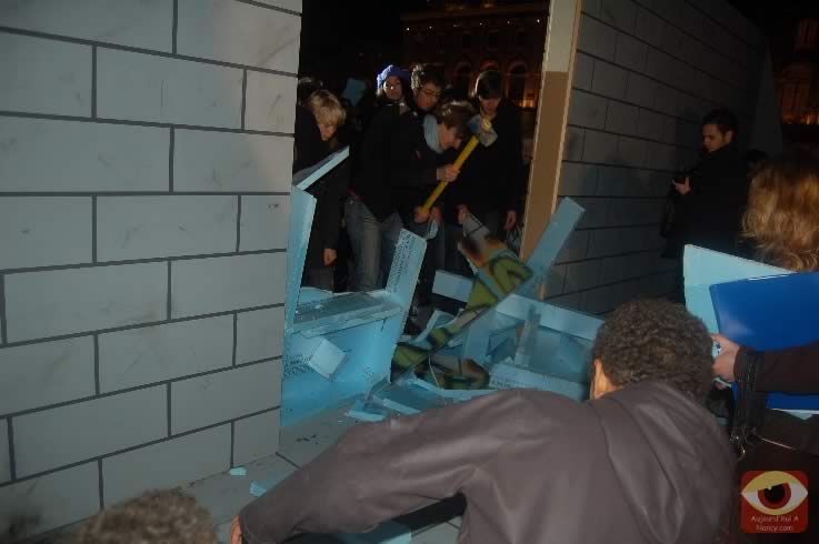 Symbolisant les deux allemagnes, les étudiants ont attaqué à la masse un mur construit pour l'occasion place Stanlsias, emblème de la villed e Nancy. Dès que la brèche fût ouverte, et quelques parois du mur démontées, poignées de mains et embrassade, symbolisant les 20 ans de cette réunifications ont eu lieu.